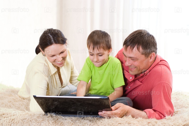 Семья с ноутбуком на ковре
