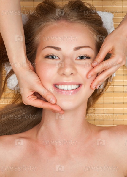 Молодой женщине в спа-салоне делают массаж лица
