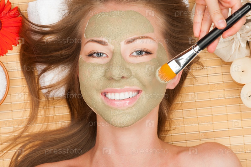 Молодой женщине в спа-салоне делают глиняную маску для лица