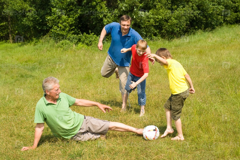 Семья играет в футбол на траве