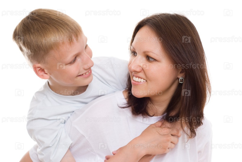 Красивая молодая мама с сыном на белом фоне