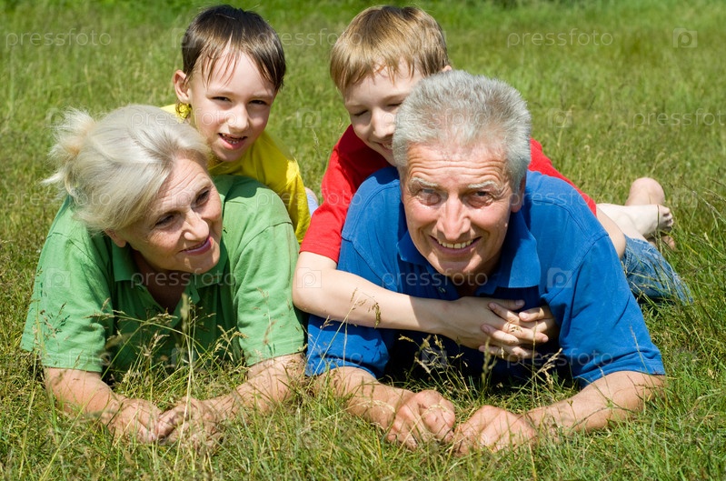 Пожилая пара со своими внуками на траве