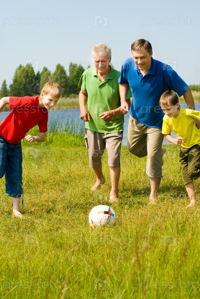 Семья играет в футбол в парке