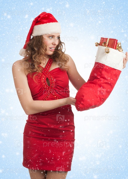 Молодая женщина в красном платье и колпаке Санта Клауса с рождественскими подарками на голубом фоне
