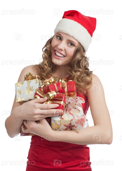 Молодая женщина в красном платье и колпаке Санта Клауса с рождественскими подарками на белом фоне