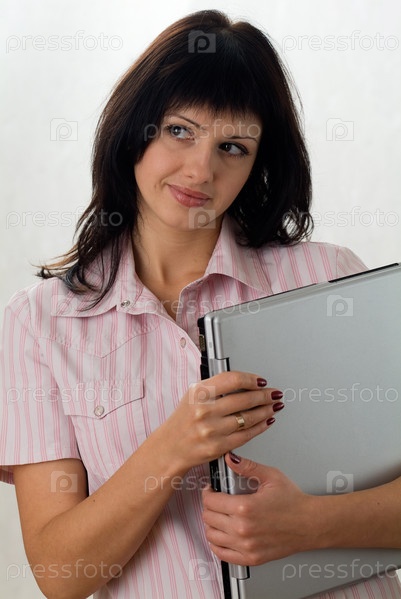 Красивая девушка держит в руках ноутбук