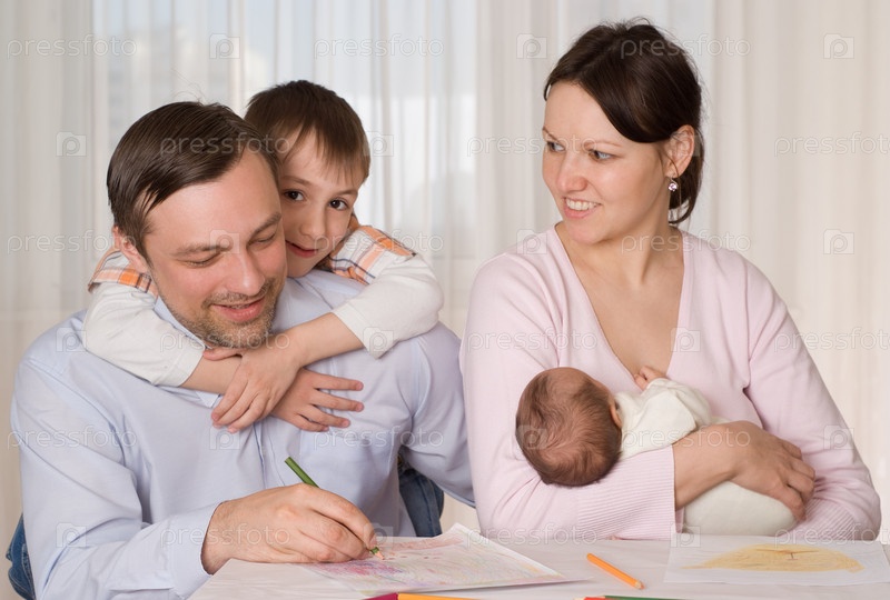 Молодая пара дома с двумя детьми