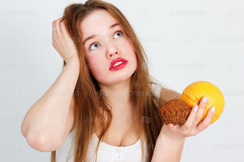 Девушка с грейпфрутом и пирожным в руках
