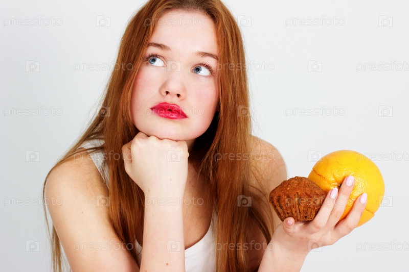Девушка с грейпфрутом и пирожным в руках