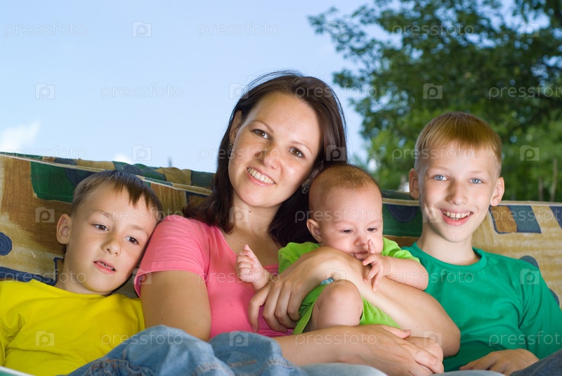 Молодая мать с детьми на фоне голубого неба