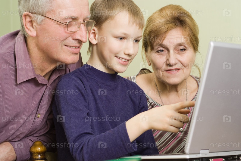 Счастливые дедушка и бабушка играют на компьютере с внуком