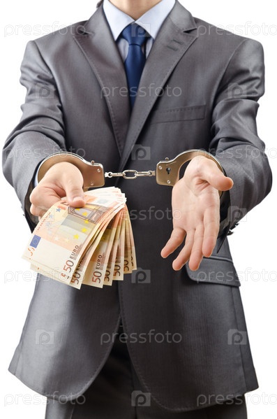Бизнесмен в наручниках с пачкой банкнот
