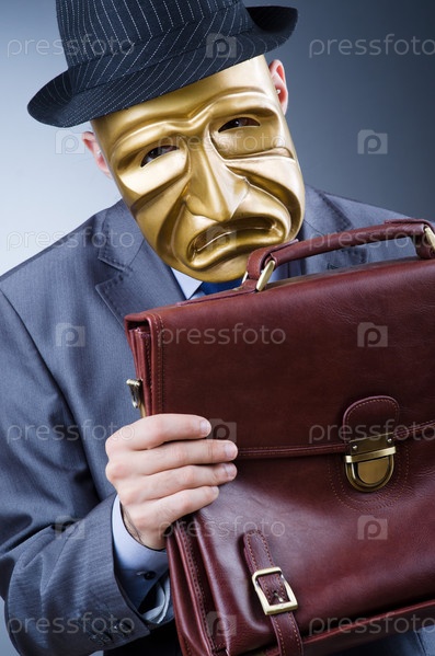 Предприниматель в театральной маске и шляпе с портфелем