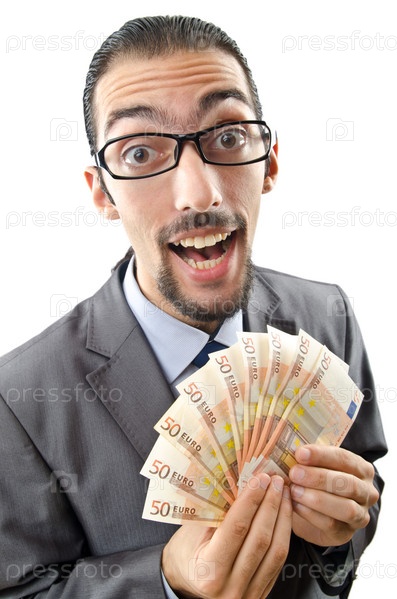 Молодой бизнесмен с евро на белом фоне