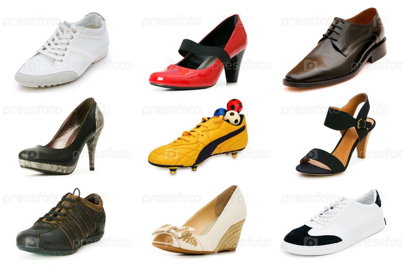 Женская и мужская обувь различных стилей на белом фоне