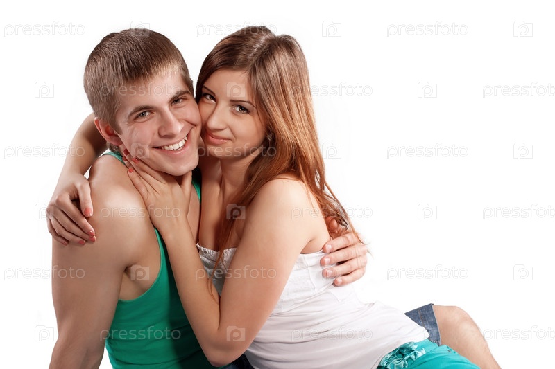 Счастливая пара обнимается на белом фоне