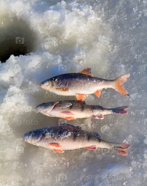 Три рыбы на льду у проруби
