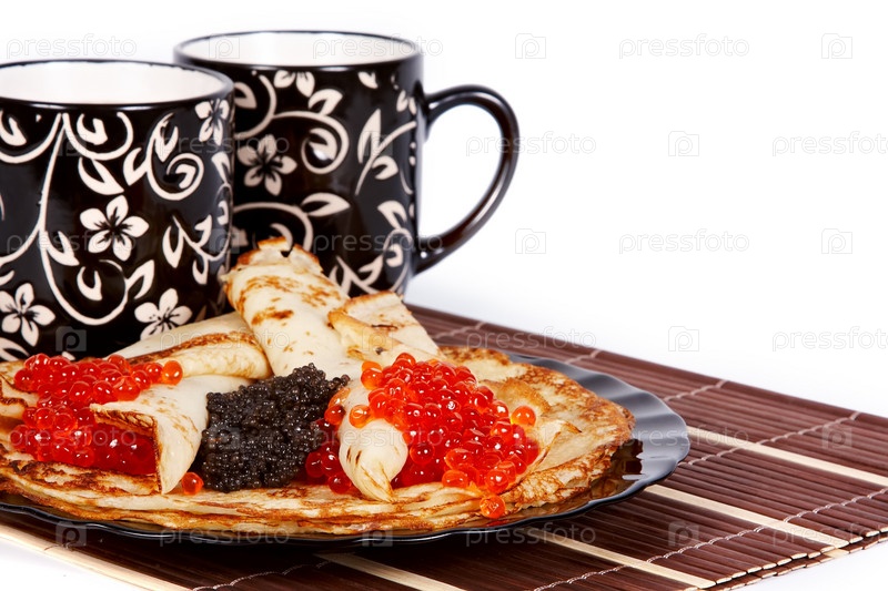 Чашки с чаем и блины с икрой на тарелке