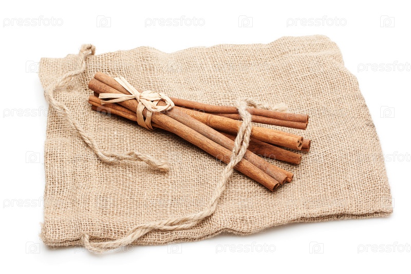 Палочки корицы на мешке на белом фоне