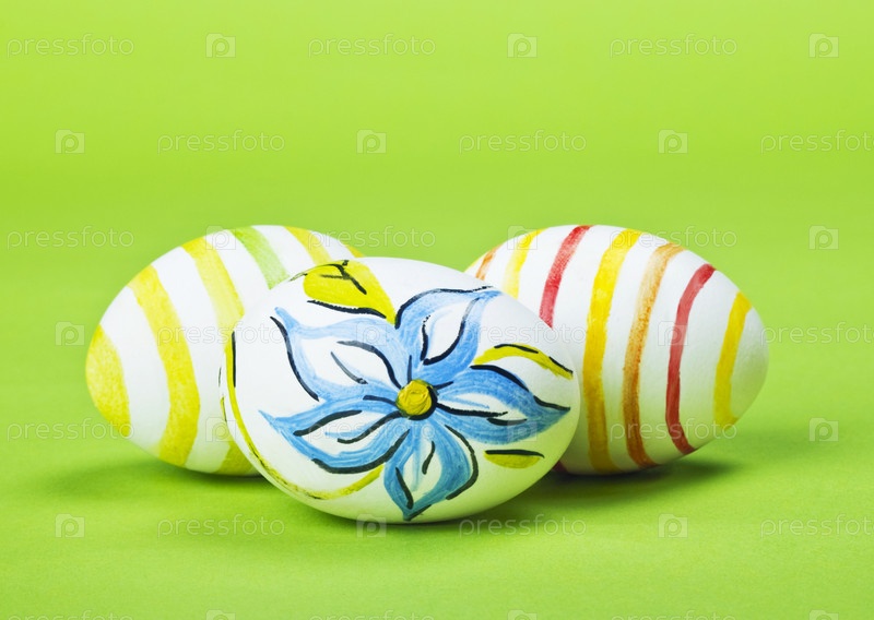 Крашеные пасхальные яйца на зеленом фоне