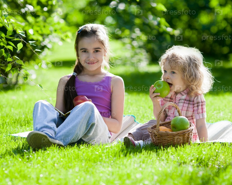 Счастливые дети едят яблоки в летнем парке