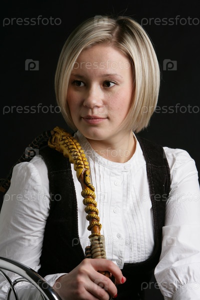 Девушка-блондинка в белой блузке и жилете с плетью в руках