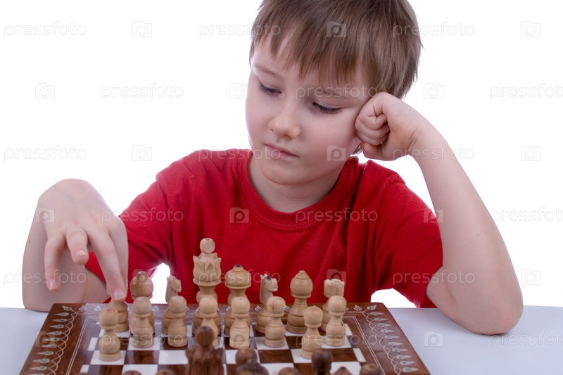 Мальчик играет в шахматы на белом фоне