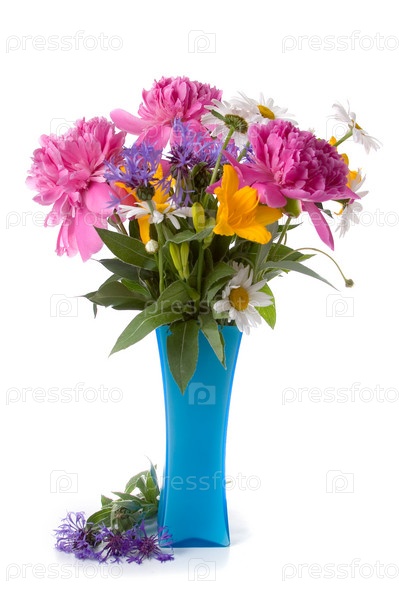 Букет красивых цветов в вазе на белом фоне
