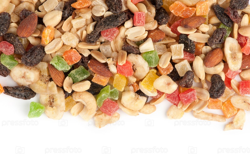 Орехи и сухофрукты на белом фоне