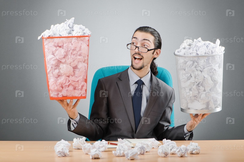 Мужчина с большим количеством использованной бумаги