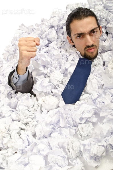 Мужчина с большим количеством макулатуры
