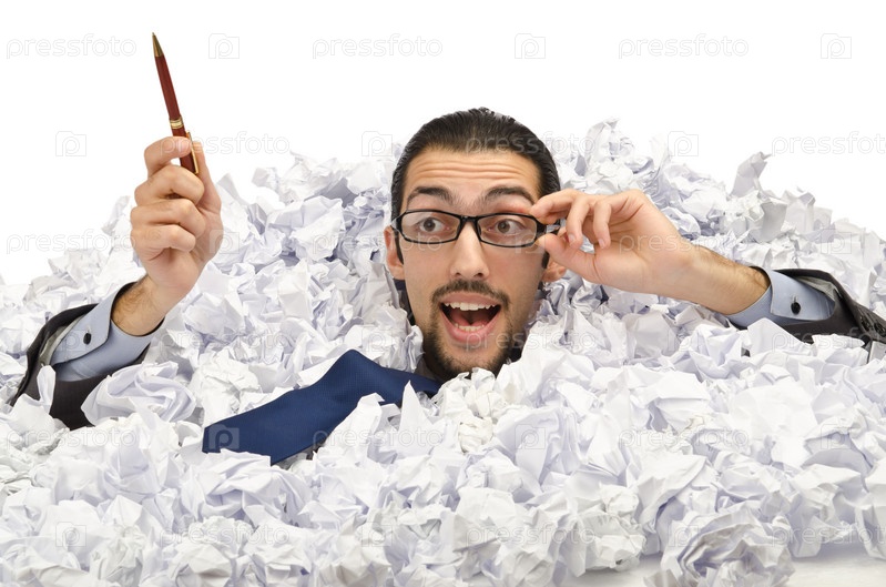 Мужчина с большим количеством макулатуры