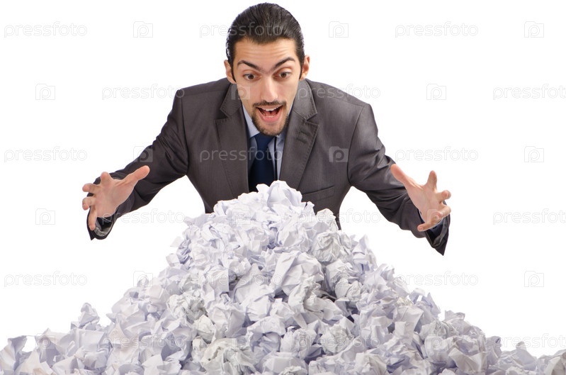 Молодой человек с большим количеством смятой бумаги