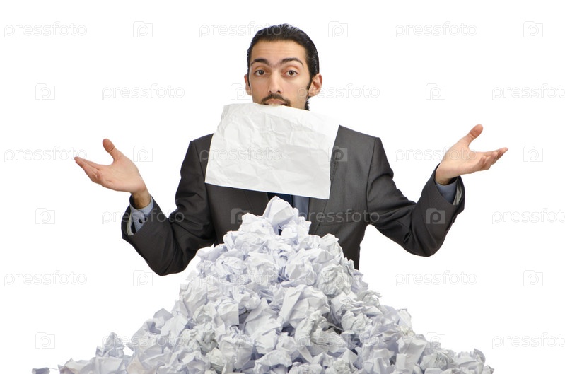 Молодой человек с большим количеством смятой бумаги