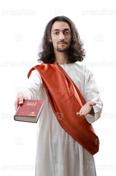 Молодой мужчина в одежде Иисуса Христа на белом фоне