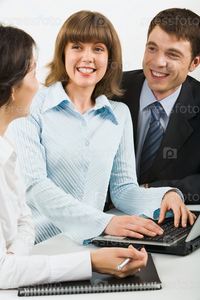 Команда из трех молодых бизнесменов собралась вокруг ноутбука, обсуждая интересный вопрос