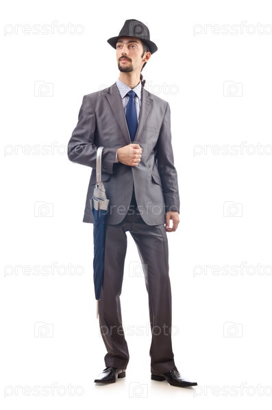 Бизнесмен с зонтом на белом фоне