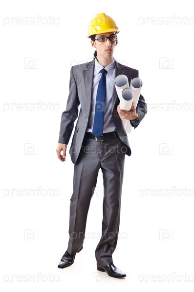 Молодой архитектор с чертежами на белом фоне