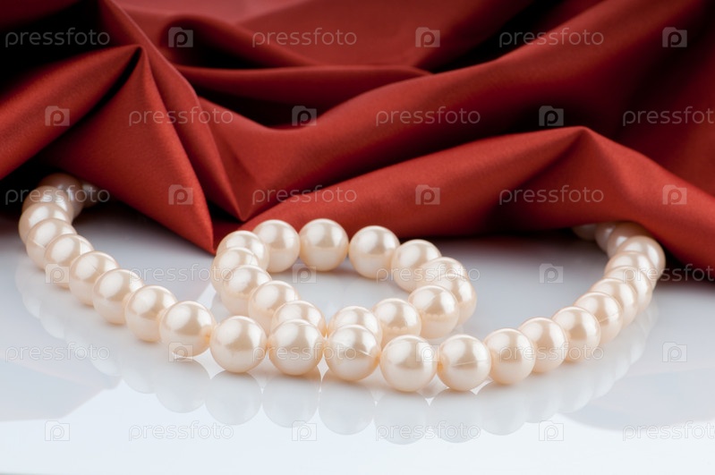 Бусы из жемчуга на фоне красного сатина