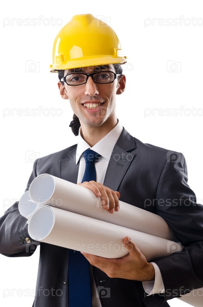 Молодой архитектор с чертежами на белом фоне