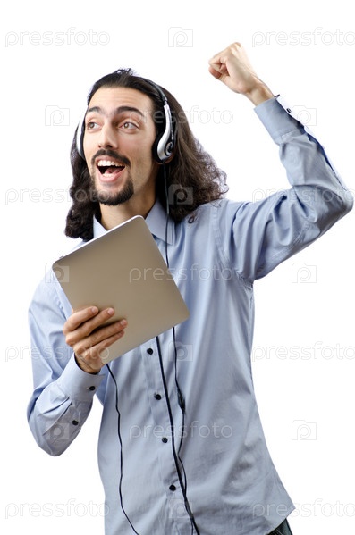 Молодой человек слушает музыку на планшетном компьютере