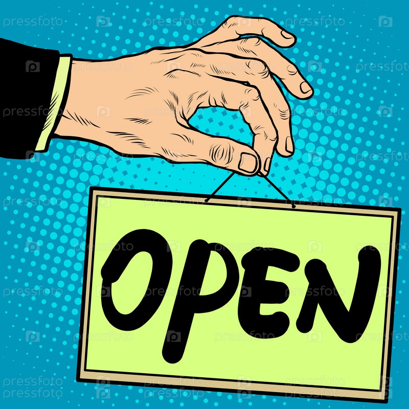Рука с табличкой "открыто"