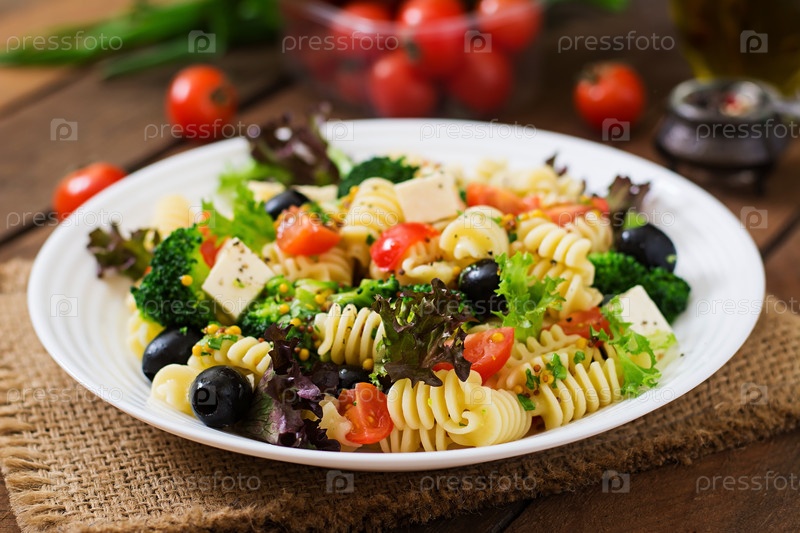 Паста-салат с помидорами, маслинами и сыром