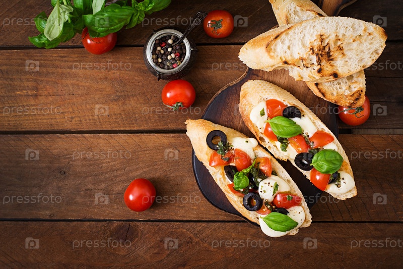 Брускетта с помидорами, сыром моцарелла и маслинами