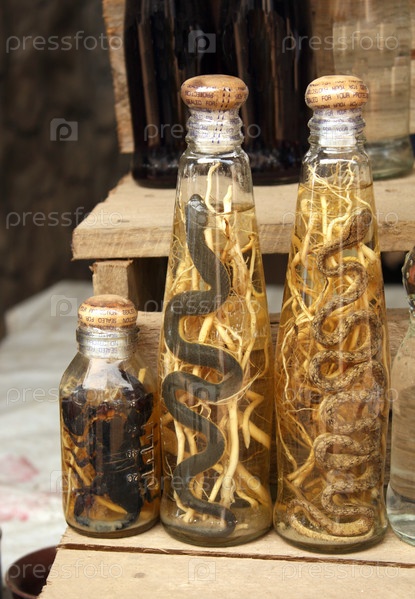 Бутылки с алкоголем со змеями и скорпионами