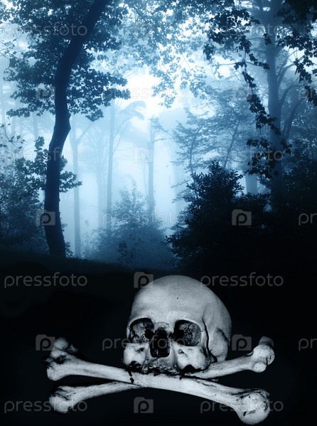 Череп и кости в темном туманном лесу