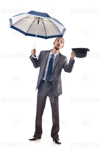 Бизнесмен с зонтом на белом фоне