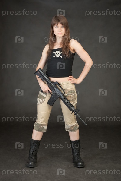 Молодая красивая девушка вооружена винтовкой и в грубых ботинках