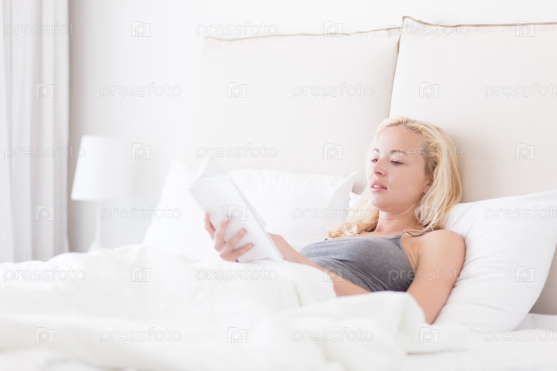 Молодая женщина с планшетом в постели