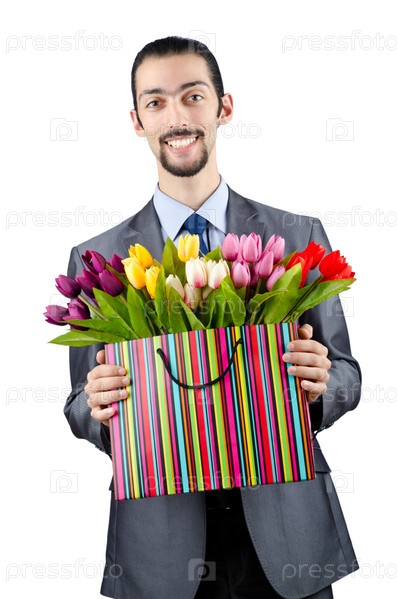Молодой человек с пакетом тюльпанов